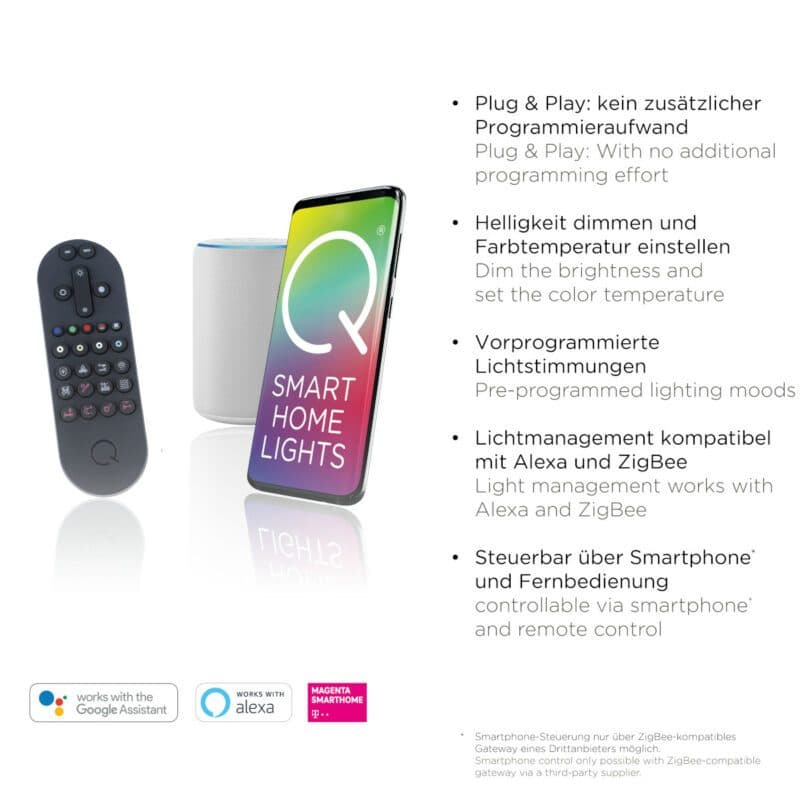 Die eingebaute Memory-Funktion sorgt dafür, dass die zuletzt gewählten Einstellungen gespeichert werden, auch wenn die Stromversorgung kurzzeitig unterbrochen wird. Für jene, die ihre Wohnumgebung in ein Smart Home umwandeln möchten, bietet die Q-Beluga Pendelleuchte die Möglichkeit zur Integration dank des Zigbee-Funkstandards. Da die Q-Beluga auch mit Alexa kompatibel ist, können Sie die Pendelleuchte auch bequem per Sprache steuern.