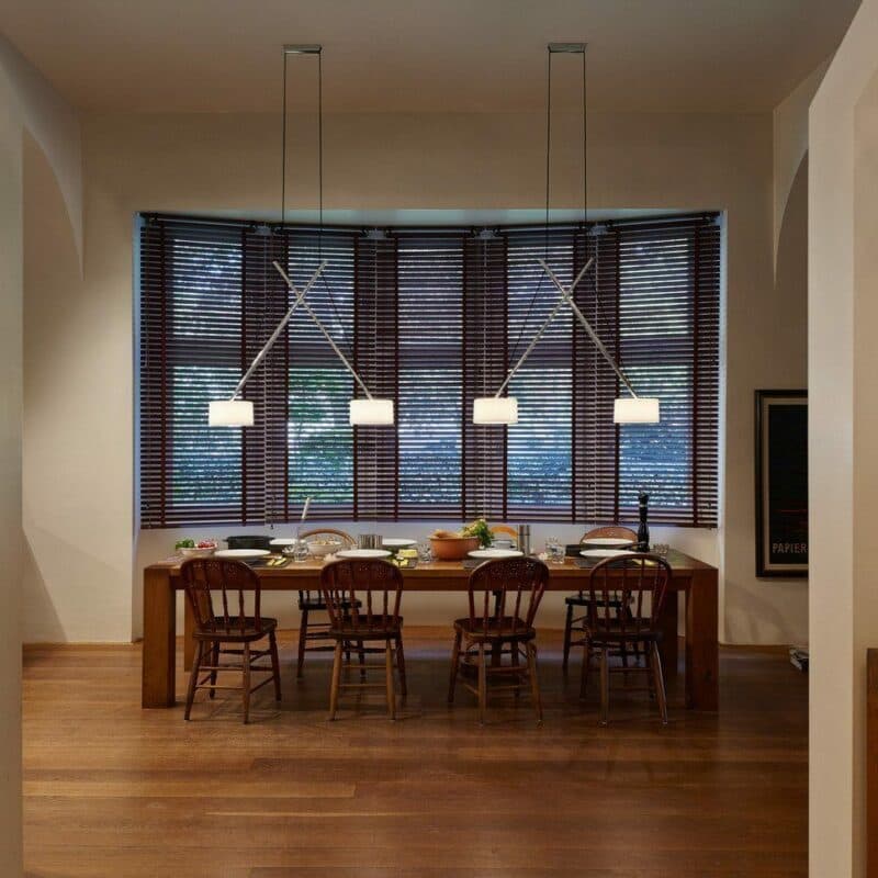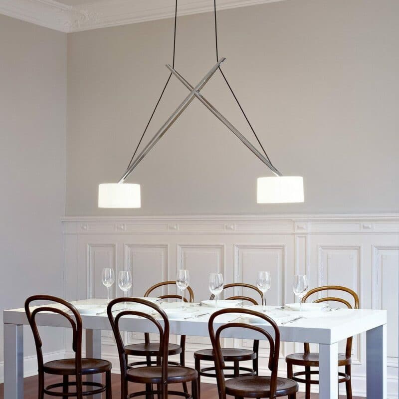 Die Twin Pendelleuchte sticht durch ihre besondere Form hervor. Wie der Name schon erahnen lässt, besteht die Leuchte aus zwei Leuchtkörpern. Die beiden zylinderförmigen Leuchtenschirme bestehen dabei aus Acrylglas. Sie sorgen für eine diffuse Lichtverteilung. Gehalten werden die Schirme von einer Konstruktion aus Aluminium. Die Höhe der Schirme lässt sich anhand der Pendel individuell verstellen. Auch der Abstand zwischen den beiden Leuchtenschirmen verändert sich damit. Die Pendelleuchte lässt sich so individuell anpassen. Sie fasst zwei LED-Leuchtmittel, welche im Lieferumfang enthalten sind. Mit 2700 Kelvin erstrahlt die Leuchte dabei in warmweißem Licht. Sonderlängen für die Pendel sind auf Anfrage möglich. Kontaktieren Sie uns dazu bitte hier.