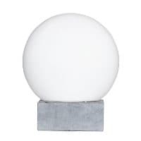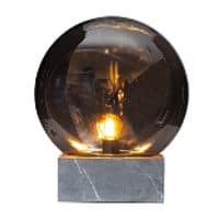 Der robuste Leuchtenfuß besteht aus grau-weiß meliertem Marmor. Dieser hochwertige Look wird durch ein flaches, rundes Glas ergänzt, das bis zu 30 Zentimeter breit ist. Je nach Blickwinkel erinnert das Rauchglas an eine elegante Kristallkugel, während die mattweiße Farbvariante durch ihr dezentes Äußeres ideal mit clean-modernen Raumkonzepten harmoniert.