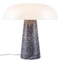 Bei der Materialwahl setzt DFTP auf natürliche Materialien wie Glas und Marmor. Der Lampenfuß ist in zwei möglichen Farbvarianten erhältlich: weiß-melierter oder grau-melierter Marmor. Je nach Variante ist auf dem Lampenschirm eine dazu passende Applikation in Messing (Weiß) oder Stahl (Grau) angebracht.
