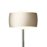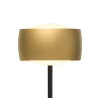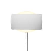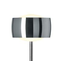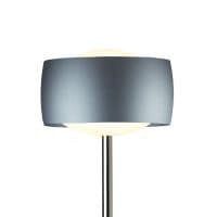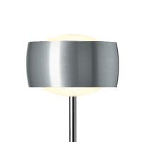 Der 13 cm große Leuchtenkopf enthält zwei satinierte Gläser, die für blendfreie und harmonische Lichtverhältnisse sorgen. Das Gestell ist schmal und minimalistisch gehalten und besitzt eine Oberfläche in Chrom beziehungsweise in Schwarz matt (bei den Farben Gold matt oder Schwarz matt). Der Sockel ist in derselben Farbe wie der Leuchtenkopf gehalten (Ausnahme: Gold matt hat einen mattschwarzen Sockel).